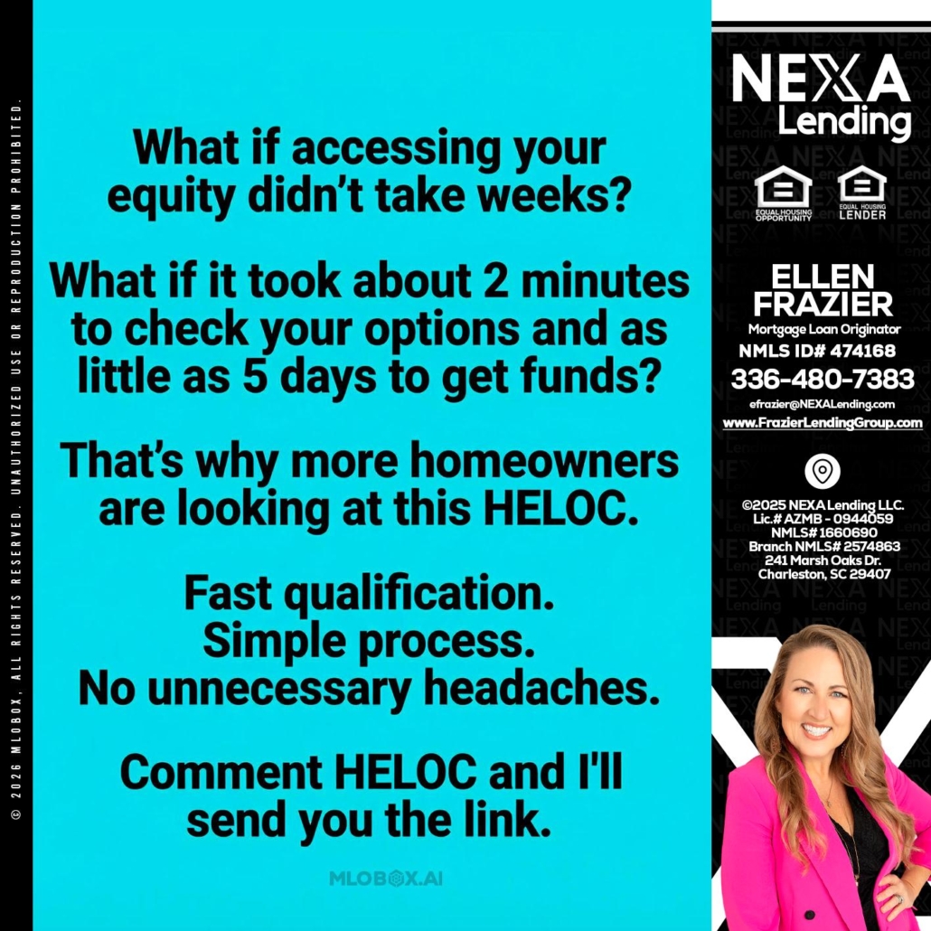 Hi, my name is Ellen Frazier. I’m a Loan Officer with Frazier Lending Group empowered by Nexa Lending, offering personalized mortgage solutions, fast customized quotes, great rates and service with integrity.