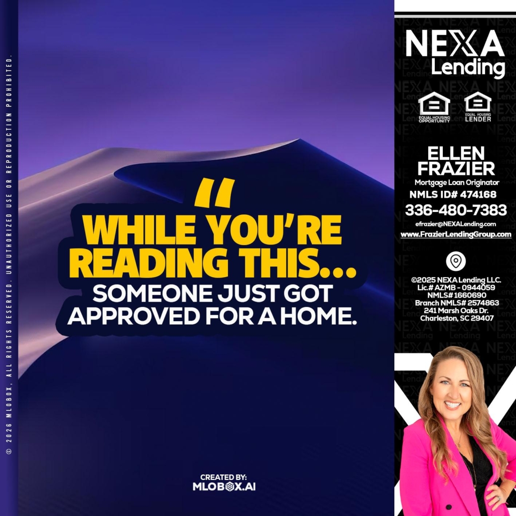 WHILE YOU - Ellen Frazier -Branch ManagerHi, my name is Ellen Frazier. I’m a Loan Officer with Frazier Lending Group empowered by Nexa Lending, offering personalized mortgage solutions, fast customized quotes, great rates and service with integrity.